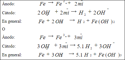 El comportamiento del aumento de la conductividad eléctrica (CE) y la corriente se atribuyen a las sales de hierro (hidróxidos de hierro) que pueden generarse durante el tratamiento de las ARLC mediante el proceso de EC. Chen (2004) describe que la generación de hidróxidos de hierro (ferroso y férrico), se da cuando los electrodos de hierro se oxidan durante la fase de operación, por causa de las reacciones químicas que ocurren entre el agua residual y los electrodos (ánodo y cátodo). Esas reacciones son descritas por Kabarty (2017), en las ecuaciones Redox que se recopilan en la figura 6.