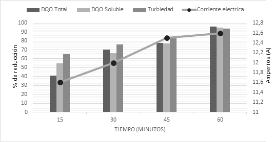 El comportamiento de la corriente eléctrica en relación con los parámetros fisicoquímicos durante el proceso de tratamiento en el electrocoagulador puede ser apreciado en la figura 7. Se observa que el aumento de la corriente ocasiona la reducción de DQOtotal, DQOsoluble y turbiedad. Resultados semejantes fueron encontrados por Elazzouzi, Haboubi y Elyoubi (2017) y Yang et al. (2015), los cuales afirman que el aumento de la densidad de corriente incrementa el porcentaje de la remoción de DQOtotal en la unidad de EC.