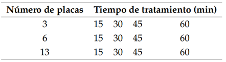 Para la evaluación del experimento se utilizó un diseño completamente al azar (DCA) en análisis factorial, considerando dos factores. Mediante el diseño se evaluaron las interrelaciones de las características de las ARLC durante el tratamiento de EC (variables respuestas) con las variables de operación del electrocoagulador, asumiendo como factor A el número de placas de cada experimento del electrocoagulador, y como factor B el tiempo de exposición del agua residual al tratamiento (tabla 1). Posteriormente, modelos matemáticos de regresión múltiple fueron ajustados a las variables respuestas en función del factor número de electrodos (A) y factor tiempo (B), con el objetivo de realizar gráficos de superficie que permitieran observar el comportamiento de todas las variables en estudio a lo largo del tratamiento y en función del número de electrodos. Todos los análisis estadísticos se realizaron con ayuda del software Statistica7.