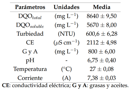 Una vez obtenida la muestra compuesta de ARLC, se determinaron los parámetros DQOtotal, DQOsoluble, turbiedad, conductividad eléctrica (CE), grasas-aceites (G y A), pH, temperatura, y corriente por triplicado, siguiendo los lineamientos técnicos establecidos en los métodos estándar (Rice, Baird e Eaton, 2012). El análisis fisicoquímico de las ARLC fue realizado en las instalaciones del laboratorio de aguas y mecánica de fluidos de la Universidad Popular del Cesar, sede Cesar (Colombia).