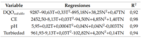 En los modelos de regresión para estimación de la DQOtotal y turbiedad, solamente los términos lineales y cuadráticos de N tuvieron efecto significativo en las concentraciones (p-valor< 0,05) (tabla 3). Con relación a la DQOsoluble, solamente el término lineal de N presentó efecto significativo en el modelo (p-valor< 0,05). El modelo de CE mostró que tanto los términos lineales y cuadráticos de N como las interacciones entre T y N tienen efecto significativo en la estimación de la CE. Finalmente, los términos cuadráticos de N y la interacción entre T y N son los factores que tienen efecto en el pH.