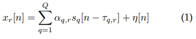 dada por la ecuación (1), donde Sq es la señal transmitida por la fuente q-ésima; αq,r es el factor de atenuación, y Tq,r es el retardo en número de muestras que sufre la señal por la propagación entre el TNq y el RNr, y