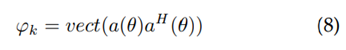 , que contiene la versión vectorizada de la matriz de covarianza del factor de arreglo para cada una de las k posiciones dentro de la grilla. Cada elemento se calcula empleando la ecuación (8), donde α(θ) se calcula con la ecuación (3), y (.)H denota la hermitiana de un vector: