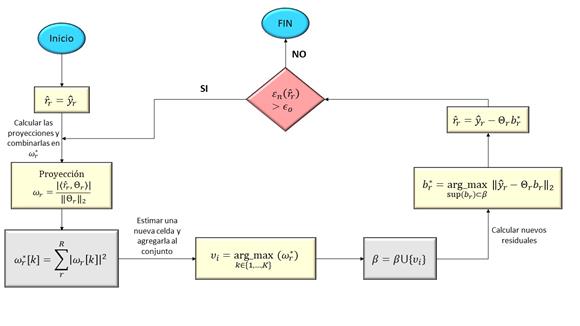 El algoritmo usado se detalla en la figura 1, el cual puede tener como criterio de parada un número de iteraciones igual al número de fuentes del sistema, siempre y cuando este sea conocido como en el caso de los ambientes colaborativos, o si se cumple una condición de parada usualmente relacionada con la energía del residual, la cual implica que la norma del residual actual es menor que un umbral definido, que usualmente es una función de la relación señal a ruido de la señal.