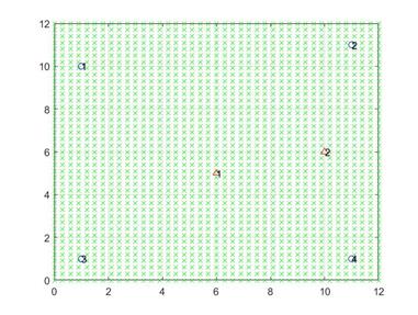 El escenario considera una ROI como la que se muestra en la figura 2, la cual tiene 4 RN (círculos azules) ubicados en posiciones fijas para todas las simulaciones, y 2 TN (triángulos rojos) los cuales se ubican de manera aleatoria dentro de la ROI en cada iteración del algoritmo. Esta figura muestra la ROI ya discretizada para llevar a cabo la construcción del diccionario. Cada una de las cruces verdes corresponde a la posición k-ésima con coordenadas