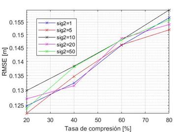 Se establecen cuatro tasas de compresión diferentes, las cuales indican el porcentaje de muestras que se toman de la señal original para realizar la estimación de la posición, y se calcula el RMSE para diferentes valores de σ2. Esto implica más o menos ruido en la medición.