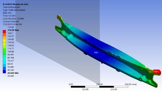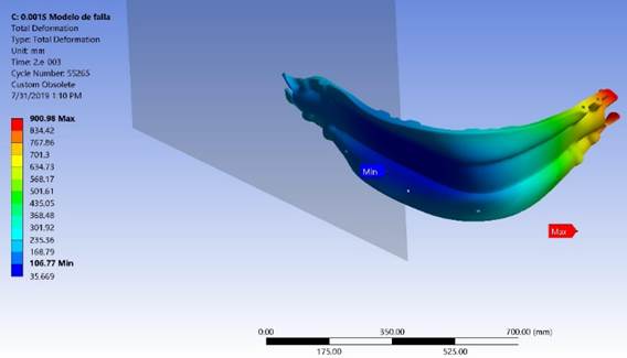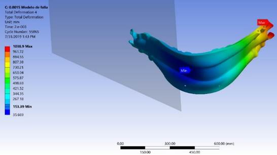 According to Figure 15, a minimum deformation of 38.78 mm and a maximum of 290.78 mm was obtained.