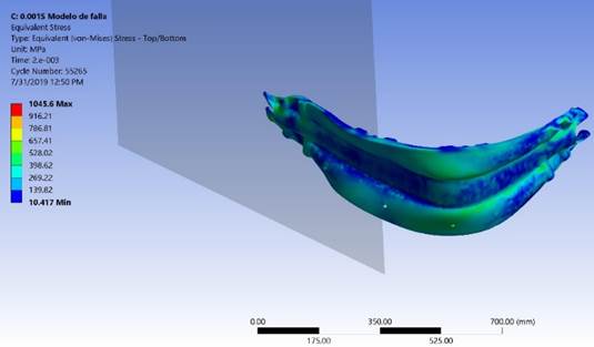 As shown in Figure 11, the maximum effort is 1.045 GPa and the minimum is 0.010 GPa. The highest concentration of stress occurs around the anchors.