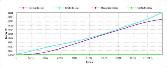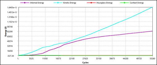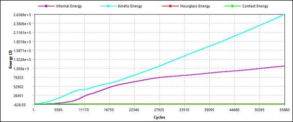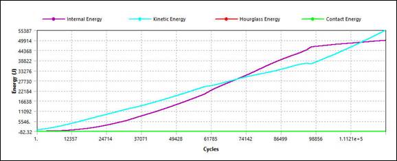 In Figure 12, the purple line represents the energy of the impact attenuator, and the cyan is the energy of the rigid wall. The intersection of the two lines represents the moment when the attenuator hits the rigid wall and begins to undergo physical changes.