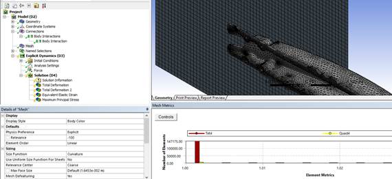 This settings were also included in Ansys for the corresponding simulation time, based on various tests performed at 0.002 seconds with a several test cycles. We also worked with the AUTODYN Standard Hourglass model, which is the most appropriate for the model to be tested because this option allows us to simulate a scenario in which the impact energy deformation of the attenuator without causing rebound.