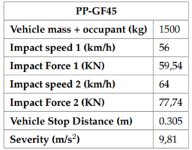 Fourth, the carbon fiber crash tests were simulated through the ANSYS 18.2 software. With these simulations, the energy absorption capacity was calculated for each of two materials (PP-GF45, the original; and PLA-CF30, the alternative).