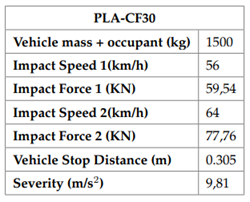 Conversely, the PLA-CF30 the following values were obtained: maximum deformation of 290.78 mm, maximum stress of 1.339 GPa and an energy absorption of 19000 J. Therefore, it can be said that the material is more resistant to deformation and stress but does not absorb too much energy.