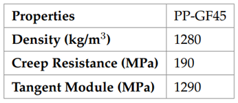 We entered the Engineering Data environment to add the PP-GF45 because it does not exist in the Ansys Workbench Explicit Materials Library. The characteristics of the material required to perform the explicit analysis are shown in Table 4.