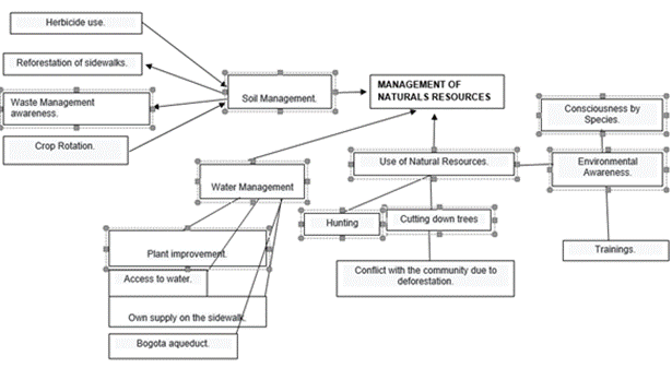 The previous scheme allows observing the management of resources in the villages under study in order to carry out an analysis from three different areas: the first under the use of natural resources in which actions such as cutting down trees, hunting and deforestation directly related to issues of training, environmental awareness and awareness for the species that cohabit with the informants; This allows us to appreciate the way in which cultural activities generated or did not affect the resource; The passage of time was included since it is subject to the objectives of each moment and allowed to determine that, at present, the appropriations of natural resources in these villages have a focus on conservation allowing a collective vision of imaginary prosperity and improvement in their socio-ecosystems through a perspective of what is right or what should be. Secondly, there is the management of water with factors such as the improvement of the water treatment plant, access to it, own supply in the village directly related to the privileged geographical location of these villages; This is confirmed by Mrs. Teresa Gutiérrez: "we are in a place where there is a lot of water, also a lot of water comes down the slope or also by gravity". It ends with a conflict with the company Acueducto de Bogotá. Similarly, when dealing with soil management, factors such as the use of herbicides, reforestation of the sidewalk, awareness of waste management are specified: “then one has at least in the house, the waste of the kitchen goes to the animals, and human waste goes to the septic tank” as related by Mrs. Gutiérrez; It is also established that they practice crop rotation to rest the soil and replace it.