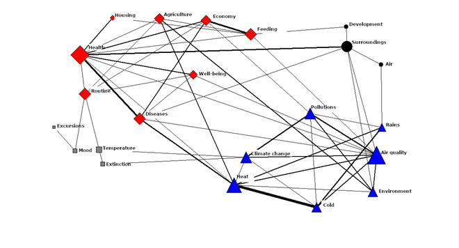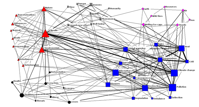 In relation to, “how the lives of the participants are affected by environmental problems,” Figure 2 shows 22 nodes with two central factions: the first refers to health, well-being, housing, and food (red diamond); and the second indicates a change in climate, air quality, and pollution (blue triangle). These central factions seem to be linked more to general environmental problems instead of a direct impact on them. On the other hand, the peripheral factions indicate temperature (gray squares) and the environment (black circles). This graph students are able to identify some direct effects on their lives, such as health-related, as well as other indirect effects related to their environment. In this regard, Armesto and Angarita (2017) comment that the relationship between human beings and nature is such that they cannot be understood in isolation; this is why knowing the effects derived from climate change will shed some light when caring for the person and for the environment. Although some confusion is observed when understanding the effects of environmental problems, they are not ignored completely. In a study carried out by Vargas, Medellín, Vázquez & Gutiérrez (2011) with university students, it is highlighted that young people are promoters of environmental awareness, which encouraged them to continue researching the consequences and environmental knowledge of this population.