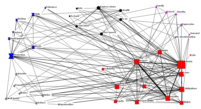 Figure 3 shows 40 different responses (nodes) with an outstanding faction related to the legal aspects of human rights (the red square), which accentuates the nodes referring to freedom, respect, and equality and is the core of social perceptions on human rights. The two factions that follow in level of importance are: the protection granted by human rights regarding help, support, and care (blue triangle); and freedom of expression, to express opinions, to express oneself, to participate, and to vote (black circle). Therefore, the results show that students associate human rights with protection and participation. On the other hand, the two peripheral factions indicate the right to be different and to identity (pink triangle), and the institutional perspective with which human rights are understood from their school vision (gray diamond). Now, in order to guarantee the protection of human dignity (Castán, 2007) and that human rights provide the opportunity to live harmoniously and free from misery, Mejía (2017) points out that the subjects who hold a set of rights need to actually know these rights in order to exercise or even demand them; and this assertion applies to human rights. The students report knowing human rights, but their answers are centered on a look at actions aimed at public participation and not on the nature of human rights, which is the protection of human dignity.