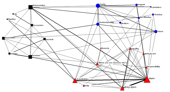 Results: The results or the responses were organized using Network Analysis (NA) to know the general opinion that this part of the population has on the environmental problem, its effects, the actions taken to address these effects, and about human rights. The results show that these students associate environmental problems mostly with trash and the only way they know to help is related to the three R’s strategy (Recycle, Reuse, Reduce).