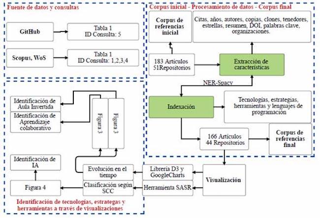 Para responder a las preguntas planteadas, se procesan las referencias utilizando diferentes implementaciones. Se construye un flujo de trabajo basado en tres procesos (figura 2): i) Las referencias; por un lado, con ayuda de NER-Spacy (Vychegzhanin y Kotelnikov, 2019), se extraen las características de los repositorios: citas, año, autor, copias, tenedores, estrellas y actualizaciones; por otro, se extraen las características de los documentos científicos: año, palabras clave, resumen, DOI, autores y organizaciones. ii) Las características extraídas son procesadas con NER-Spacy, para obtener entidades específicas, por ejemplo: técnicas, estrategias, métodos, tipo de tecnología, tipo de software y lenguajes de programación. iii) Se construyeron dos visualizaciones: la primera se construye a partir de la librería D3 (Bostock, s. f.) para visualizar la evolución tecnológica de los proyectos más relevantes, estrategias de aprendizaje, tipos de tecnologías y los lenguajes de programación utilizados en los últimos siete años. La segunda se construye con la herramienta SASR (Guerrero, 2019), para clasificar a través de una ontología de datos que contiene las líneas y sublíneas de las ciencias de computación, tomadas del Sistema de Clasificación por Computadora (CCS) (Association for Computing Machinery (ACM), s. f.).