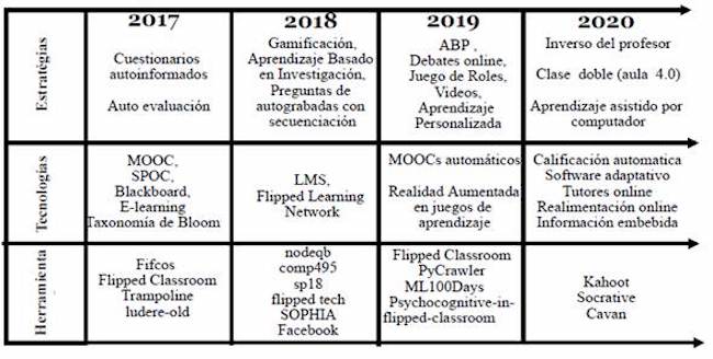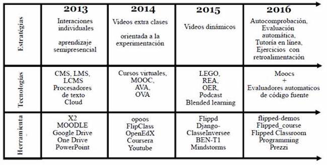 Entre los años 2013 y 2016 se utilizaron varias estrategias que aportaron al aula invertida como apoyo al aprendizaje de la programación, el primer aporte se basó en la interacción individual, donde el estudiante adquiere unos conocimientos y desarrolla ejercicios relacionados a código fuente de forma individual, aquí el profesor se enfocó en el análisis y comprensión de los contenidos y la motivación del estudiante por el aprendizaje. Luego se implementó el aprendizaje semipresencial que combina la presencialidad (desarrollo de actividades en el aula) con el trabajo en línea (uso de internet y herramientas digitales) para cambiar los procesos de enseñanza/aprendizaje, pasando del trabajo individual al colaborativo, apoyando el desarrollo de programas en parejas y pequeños grupos. Después se incorporaron videos realizados por los profesores al proceso de enseñanza, los estudiantes generaban su visualización en jornadas extraclase y usaban la clase presencial para el desarrollo de ejercicios y proyectos de programación, con la retroalimentación del profesor y el apoyo de los compañeros (Bachelor y Bachelor, 2019; Nunn et al., 2016).