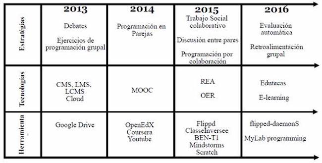 Durante estos años se encuentran proyectos relevantes para el apoyo del aprendizaje, tecnologías como sistemas de gestión de contenidos (CMS, por su sigla en inglés), entorno virtual de aprendizaje (EVA) y objetos virtuales de aprendizaje (OVA), han evolucionado desde su implementación con escasos elementos de configuración y poco material disponible, hasta sistemas que integran metodologías para fortalecer el desarrollo del aprendizaje de manera intuitiva, la educación basada en proyectos y las comunidades de aprendizaje autónomo (Barik et al., 2013; Grover et al., 2014). En el desarrollo de herramientas y estrategias se encuentran trabajos basados en aula invertida para la enseñanza de lenguajes de programación como Python, Ruby, Objective-C, JavaScript, R y Swift en cursos gratuitos (Ahmed et al., 2016; Hayashi et al., 2015; Pe Rosiene y Rosiene, 2015), que implementan estrategias como cuestionarios informados, evaluadores de código fuente, juego de roles, entre otras, que se apoyan en videos interactivos, debates virtuales, plataformas con compiladores en línea y tecnologías como recursos educativos abiertos (OER, por su sigla en inglés) (Johnson et al., 2016).