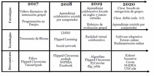 En 2017 y 2018 se implementaron varias estrategias a los procesos de enseñanza, por ejemplo, la evaluación automática, que utiliza una metodología de evaluación en línea y que permite detectar de las preguntas a evaluar cuáles se contestan correctamente y cuáles no, tras realizar el estudio previo del material correspondiente a programación. También se implementó la tutoría en línea, donde el estudiante solicita al profesor una orientación a través del sistema de gestión de aprendizaje y el docente la realiza sin necesidad de tener presencialidad con el estudiante, estas tutorías se pueden grabar y sirven de soporte para el aprendizaje de otros estudiantes.