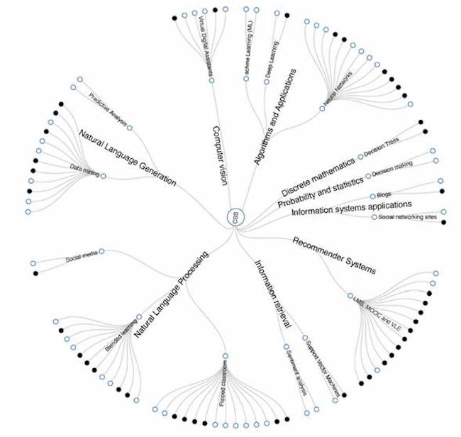 En la figura 6 se muestran las referencias según las técnicas computacionales a partir del Sistema de Clasificación de Computación de ACM. Se detallan los artículos y proyectos (puntos negros: artículos, puntos blancos: repositorios), esta clasificación indica la tendencia del uso de las técnicas de inteligencia artificial.