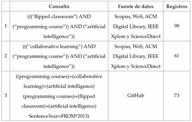 Se plantearon preguntas de interés que identifican el estado actual a partir de dos estrategias pedagógicas utilizadas para apoyar el aprendizaje de la programación: ¿Cuál es el estado actual de las tecnologías, estrategias y herramientas basadas en aprendizaje activo y el aprendizaje colaborativo como apoyo al aprendizaje de la programación?; ¿cómo el aula invertida y el aprendizaje colaborativo a través de técnicas computacionales de inteligencia artificial apoyan los cursos de programación?; ¿cuál es el papel de la inteligencia artificial en el aprendizaje de los cursos de programación?