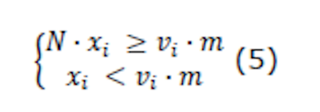 It is highlighted that, if v_i ∙ m> 0, the first restriction of Equation (5) is x_i = 1, while the second restriction ensures that x_i = 0 if v_i ∙ m = 0.