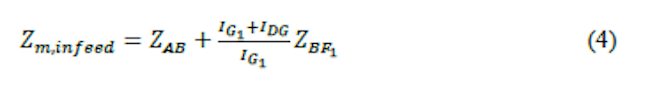 where, 𝑍𝑚,𝑖𝑛𝑓𝑒𝑒𝑑 is the measured impedance considering the infeed effect, 𝐼𝐺1 is the fault current contribution from the utility source and measured by the relay, and 𝐼𝐷𝐺 is the fault current contribution from the DG on node B. If only the fault resistance (RF ) is considered, the impedance seen by the relay 21 is obtained as expressed by Equation (5).