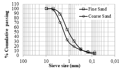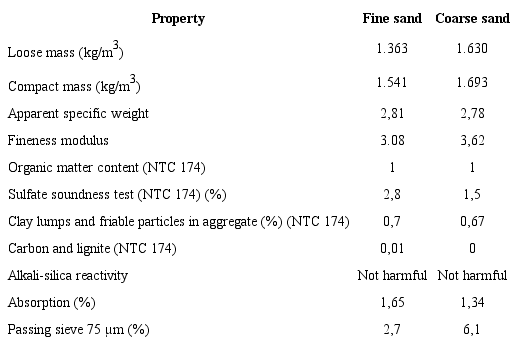 The granulometry tests for the aggregates used in this research are shown in Figure 1. The results show a size distribution with soft continuous changes for both the fine and coarse sands. For sand to have a good gradation, it must have a uniformity coefficient of 6 or more and a curvature coefficient higher than 1 and lower than 3 (Juárez-Badillo & Rico-Rodríguez, 1998). The results for the uniformity coefficient for both fine and coarse sand were 5,739 and 8,798, respectively. Furthermore, the curvature coefficient for fine and coarse sand was 1,045 and 2,286, respectively. Therefore, fine sand does not have not the best gradation, as it does not fulfill the two requirements regarding uniformity and curvature coefficient, whereas coarse sand fulfills both requirements.