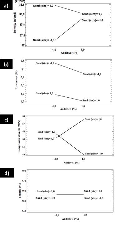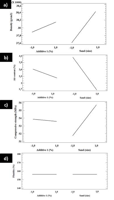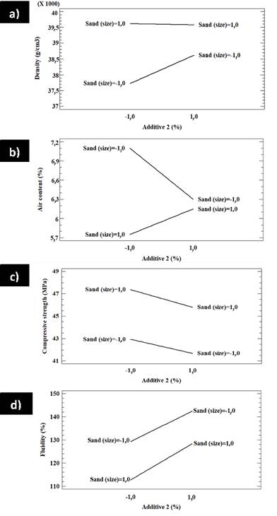 Similarly, Figure 11 shows how changes in additive 2 and sand content affect the density, air content, compressive strength, and fluidity of factorial design B. This Figure shows that, by increasing the contents of additive 2 and the sand grain size, a density increase is produced, whereas the air content is decreased (Figure 11b). Figure 11c shows that, when the amount of additive 2 increases, the compressive strength decreases. On the other hand, an increase in the sand grain size produces an increase in compressive strength. Figure 11d shows that, by increasing the additive 2 content, fluidity increases, which also occurs when the sand grain size increases.
