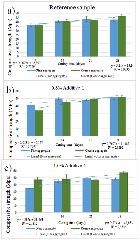 Figures 2 and 3 summarize the compressive strength measured at 7, 14, 21, and 28 days of curing. In case of the reference sample summarized in Figures 2a and 3a, which corresponds to the sample without additives, the strength of the sample with fine sand increased almost linearly by 3,62%, showing a correlation of 0,77. The strength of the sample with coarse sand also increased almost linearly by 5,43%, with a correlation of 0,93. Figure 2b shows samples with 0,8% of additive, with fine sand at 5,15% and a correlation of 0,73. Samples with coarse sand also showed a linear tendency towards increasing the strength with curing time, with a slope of 10,10% and a correlation of 0,55. Figure 2c shows the compressive strength for samples with 1 wt% of additive 1. Samples containing fine sand increased their slope by 7,67% and showed a correlation of 0,73, whereas, for coarse sand, the slope was 5,01% with a correlation of 0,89.