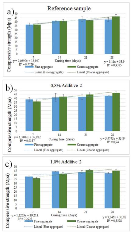 Figure 3b shows the results for samples containing 0,8 wt% of additive 2. Samples containing fine sand exhibited a slope of 2,34% and a correlation of 0,94, and samples with coarse sand also showed a linear tendency: a slope of 6,08% and a correlation of 0,94. Finally, Figure 3c shows samples with 1 wt% of additive 2; fine and coarse sand also showed a linear tendency towards increased strength with curing time. Fine sand exhibited a linear inclination of 1,97% and a correlation of 0,29, whereas coarse sand showed a slope of 5,68% with a correlation of 0,85. In general, Figures 2 and 3 show that the compressive strength is higher for larger sand sizes. A similar conclusion can be drawn regarding the additive: the more additive content, the higher the compressive strength, although samples with additive 2 (Figure 3) did not show a significant change in compressive strength with respect to the reference sample.