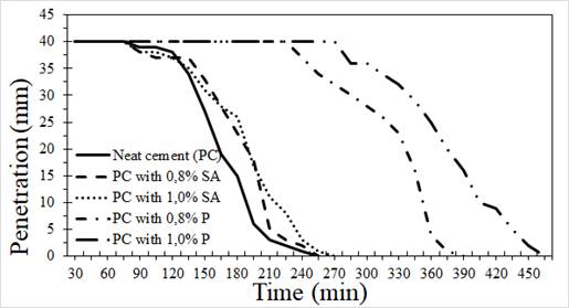 The setting time was estimated with a Vicat needle while following the ASTM C191 standard (ASTM International, 2013a). Tests were conducted on cement paste and cement paste with additives. The initial setting time was obtained when the needle penetration was 25 mm, and the final setting time was obtained when it was 0,0 mm. In order to reduce the external environmental effects, all samples were maintained at 20 °C in a humid room.