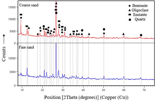 The XRD spectra for both fine and coarse sand are shown in Figure 5. The main phases found are oligoclase, bentonite, quartz, and enstatite. Figure 6 shows the case of cement paste with 0,8 wt% of additives 1 and 2. Calcium silicate hydrate (CSH), ettringite, and portlandite (Ca(OH)2) were identified in this test. From these results, it is clear that the type of additive does not affect the composition of cement-hydrated phases. A close comparison of the XRD spectra of the samples containing additives 1 and 2 reveals that the intensity of the peaks is lower for samples with additive 1, which is associated with a lower growth rate of ettringite (Aïtcin & Flatt, 2015). This intensity decrease was also obtained in the case of portlandite. A peak at 31,13 has been associated with the CSH affected by the adsorption of polycarboxylate in Ca(OH)2 nucleation (Diamond & Bonen, 1993).