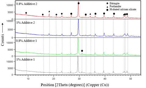 The use of the studied additives affected the degree of crystallinity of the portlandite and ettringite phases, which can lead to denser structures in the cement paste mixtures.