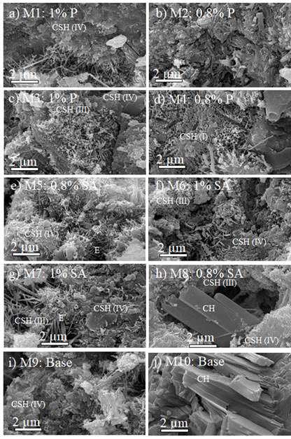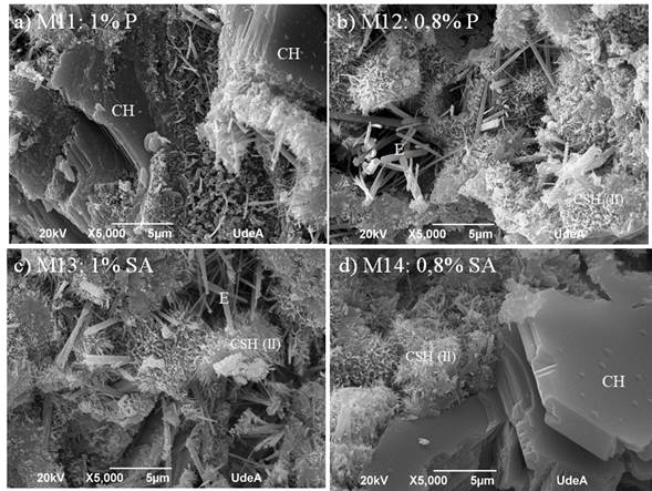 In order to stop the hydration reaction, samples cured for 28 days were submerged in acetone. Then, a drying process was carried out in all samples for 24 h at 55 ºC using an electric (joule) furnace. A JEOL JSM 6700R SEM was used in this research, which operated in high vacuum mode. For SEM characterization, the samples were fractured in order to expose their internal microstructure, and they were then sputtered in a Hummer 6.2 system operating at 15 mA AC for 30 s. This was done in order to make the surface conductive by the deposition of a thin film of gold. The samples were also chemically analyzed via energy-dispersed spectroscopy (EDS) adapted to the SEM.