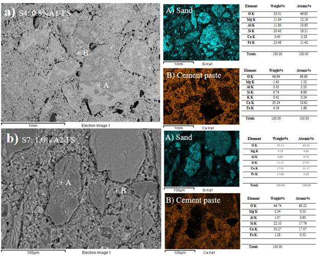 CSH as fibrous particles were identified, namely those with reticular growth (type 1), reticular with fibrous structures in radial growth from the cement grain (type 2), globular (type 3), and amorphous gel (type 4) (Diamond & Bonen, 1993). Portlandite (CH), as usual, was in the form of parallel plates with a prismatic pseudo-hexagonal shape (Galan et al., 2015). Ettringite (E) in circular shapes was also observed. Figure 9 shows the SEM-EDS for selected samples. Figure 9a corresponds to sample 4, which is cement paste with coarse sand and 1,0 wt% additive 1 and showed the highest compressive strength. No pores were found, which supports the results regarding air content for this formulation. Figure 9b corresponds to sample 7, which is composed of fine sand with 1 wt% additive 2 and exhibited the lowest compressive strength values. Very few pores were found, which also confirms the air contents presented in this research. The images also show that the samples are basically composed of two materials: one with a high calcium content due to the cement paste; and another with a high content of silica and aluminum, most likely due to the aggregate.