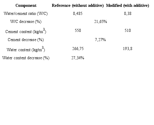 Conclusions: Additive 1 (based on polycarboxylate) reduces the water-to-cement from 0,485 to 0,38, which corresponds with a cement reduction of 7,3% and a water reduction of 27,3%.