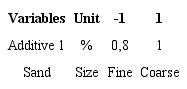 A multilevel factorial design (Carter Jr., 1990) was implemented in this research using the Statgraphics statistical software, with the purpose of evaluating the main effects and the interaction of each factor (additive 1, additive 2, and sand) in the response. Two factorial designs were made since additive 1 and 2 should not be mixed. For a complete graphical representation, 3D response surface plots were generated to show the relationships between the experimental variables and their responses (Solaiman et al., 2016). Tables 4, 5, 6, and 7 summarize the method and its results.