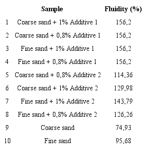 Regarding the fluidity of the mortar, Table 8 shows that fluidity is below the required percentage (120%), considering that a mix with fine sand generally has a fluidity percentage (95,68%) higher than a sample with coarse sand (74,93%). Formulations with additive exhibit an increase in fluidity with respect to samples without additive, which allows the mixes to be used as pumpable concrete. Moreover, mixes with additive 1 have a higher fluidity (156,20% more than samples with additive 2). It is also observed that, by increasing the additive content, the fluidity increases as well. Therefore, since a higher adsorption of this additive (superplasticizer) over cement grains produces a higher fluidity (Burgos-Montes et al., 2012), it is inferred that the dispersion capacity of additive 1 is higher than that of additive 2. Therefore, a larger amount of additive 2 is required (Sakai et al., 2006).