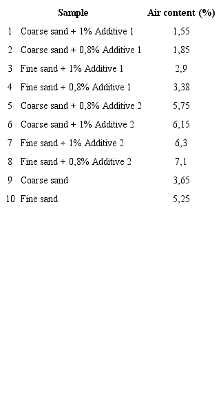 Table 9 summarizes the air content of the samples. Those with additive 1 and coarse sand showed the lowest air content among all samples. Moreover, all samples with additive 1 had a lower air content than those with additive 2. Air bubbles are present in powdered materials and also are produced by the mixer (Šeputytė-Jucikė & Kligys, 2016). Therefore, the rheology of the mix altered by the superplasticizer can produce significant changes in the air content. A less viscous mix can more easily release bubbles through the surface, which is certainly true for additive 1, whereas the higher viscosity of additive 2 hinders bubble mobility and causes a large number of them to remain in the mix (Aïtcin & Flatt, 2015).