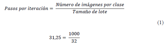 Aplicando la ecuación (1), por cada clase se tomaron 1000 imágenes, y como tamaño de lote se estableció 32 que por lo general es el valor predeterminado. Con esto se obtuvo un valor para los pasos por iteración de 31,25.