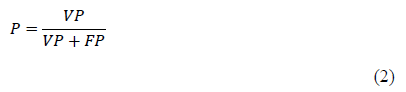 - Precisión (p). Consiste en el conjunto de registros verdaderos positivos (VP) dividida entre la suma de verdaderos positivos (VP) y falsos positivos (FP) logrados en la ejecución del modelo.
