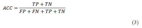 - Exactitud (accuracy, ACC). Porcentaje de casos en los que el algoritmo ha acertado positivamente, en pocas palabras, es la medición del número de predicciones correctas sobre el número total de predicciones.