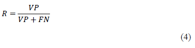 - Exhaustividad (recall, R). Medición de integridad definida como el fragmento de la cifra de registros verdaderos positivos (VP) fraccionados por la adición de los verdaderos positivos (VP) y registros clasificados como falsos negativos (FN).
