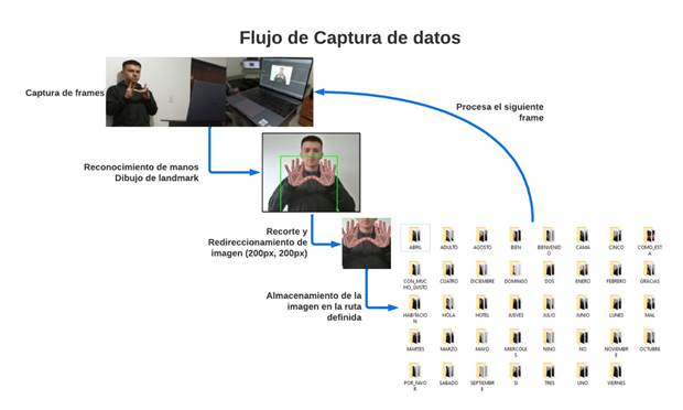 El proceso para realizar las señas y movimientos correctos se basó en el diccionario de LSC (Insor, s. f.). Estos datos ingresaron al sistema a través del uso de una cámara que registró los cuadros (frames) de video. Luego, el algoritmo reconoció las manos y dibujó el landmark con los 21 puntos de interés; seguido de esto, se recortó la imagen de manera que quedaran únicamente las manos. Una vez se obtuvo la imagen recortada, se aplicó un redimensionamiento de (200px, 200px) y por último, se almacenó en la carpeta correspondiente a la clase de la seña, como se puede observar en la figura 2. De esta manera fue posible gestionar los datos para su posterior procesamiento. Para el proceso se tomaron 39 palabras incluyendo algunos números y frases básicas en lengua de señas.