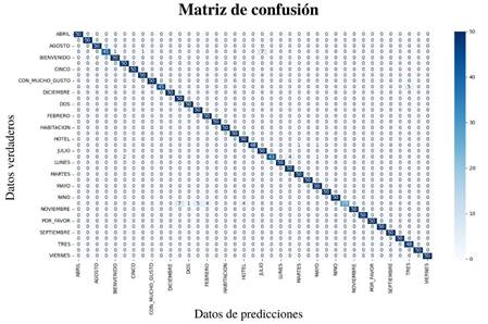 Como medida de desempeño del modelo se generó una matriz de confusión con base en la información que arrojaron las pruebas con 50 imágenes por cada seña del conjunto de datos. La matriz de confusión se produjo de manera que las columnas eran los datos que predijo, y las filas, los datos verdaderos, como se observa en la figura 6.