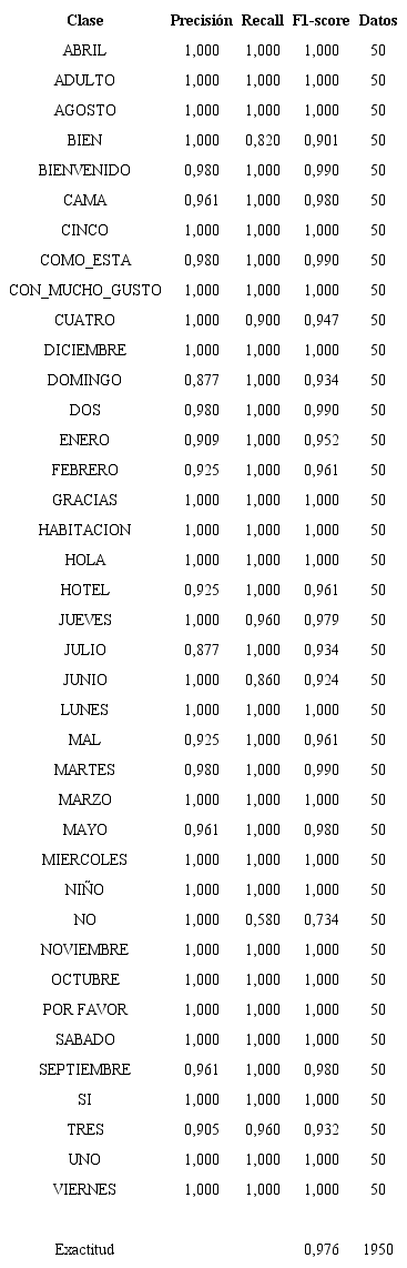 Conclusions: Finally, a model capable of identifying and translating 39 different signs between words, numbers and basic phrases focused on the hotel sector was obtained, where a success rate of 97.6% was obtained in a controlled use environment.