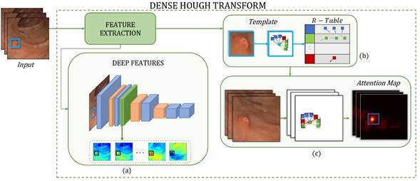 Polyps are observed as nonparametric shapes with high appearance and geometric intra- and inter-patient variability. Local modeling of these masses is demanding while dealing with such variations. In this work, DHT is a multidimensional feature voting scheme that operates at the pixel level and allows generating flexible and independent dense representations of geometric or appearance structures (Manzanera, 2012). Specifically, the polyp region is encoded into a template and mapped through a video sequence, and the spatial regions with the highest probability of polyp matching are highlighted, i.e., the attention maps that summarize the responses in Hough's multidimensional space. This process consists of two phases: polyp template learning and searching for the polyp template in subsequent frames for detection. This can be described as follows: